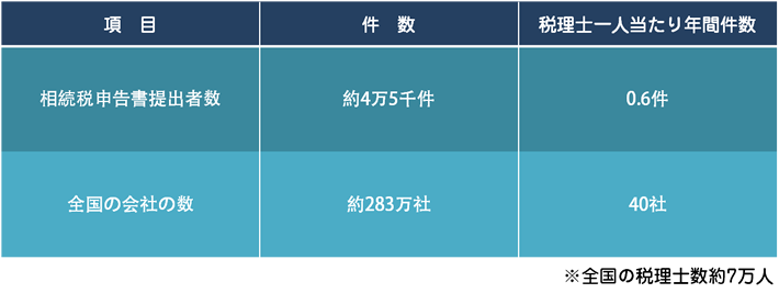 下の表を御覧ください。現在、日本国内には約7万人の税理士がおりますが、相続税については、年間に一人携わるかどうかという現実です。