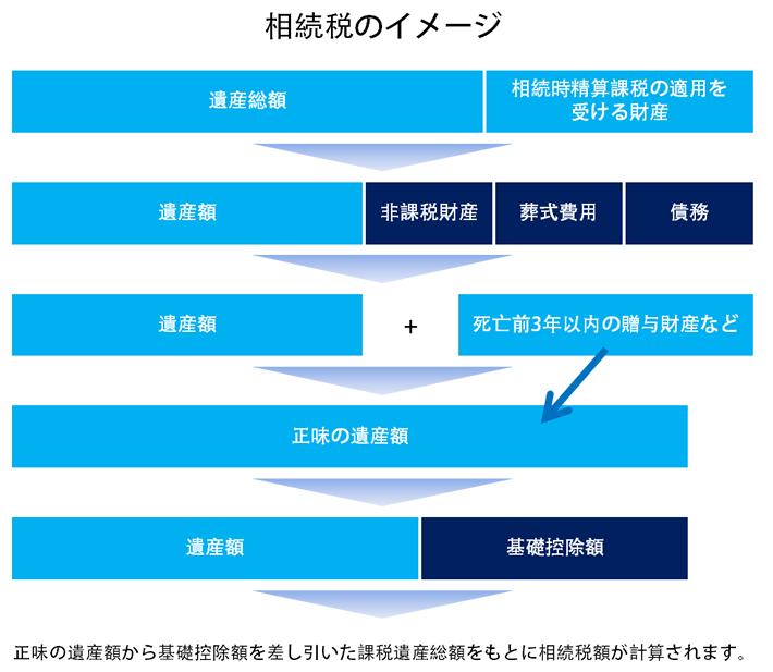 相続税は、遺産から葬式にかかった費用、非課税となる財産、借入金などの債務を差し引いた額をもとに計算されます。